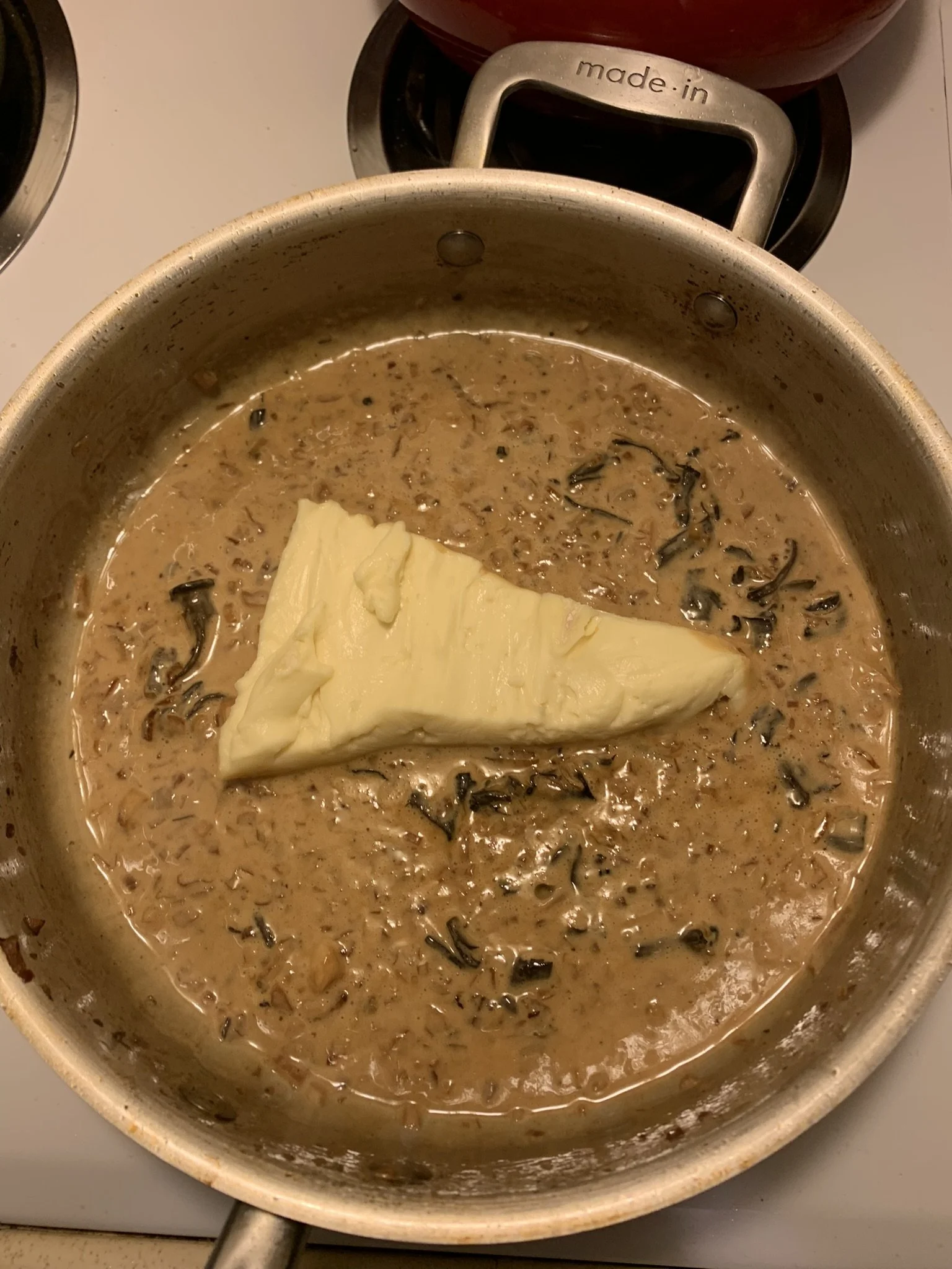 Remove the rind of a large wedge of soft brie cheese and add cheese to the pot, breaking it up into chunks in the pan so it melts faster.